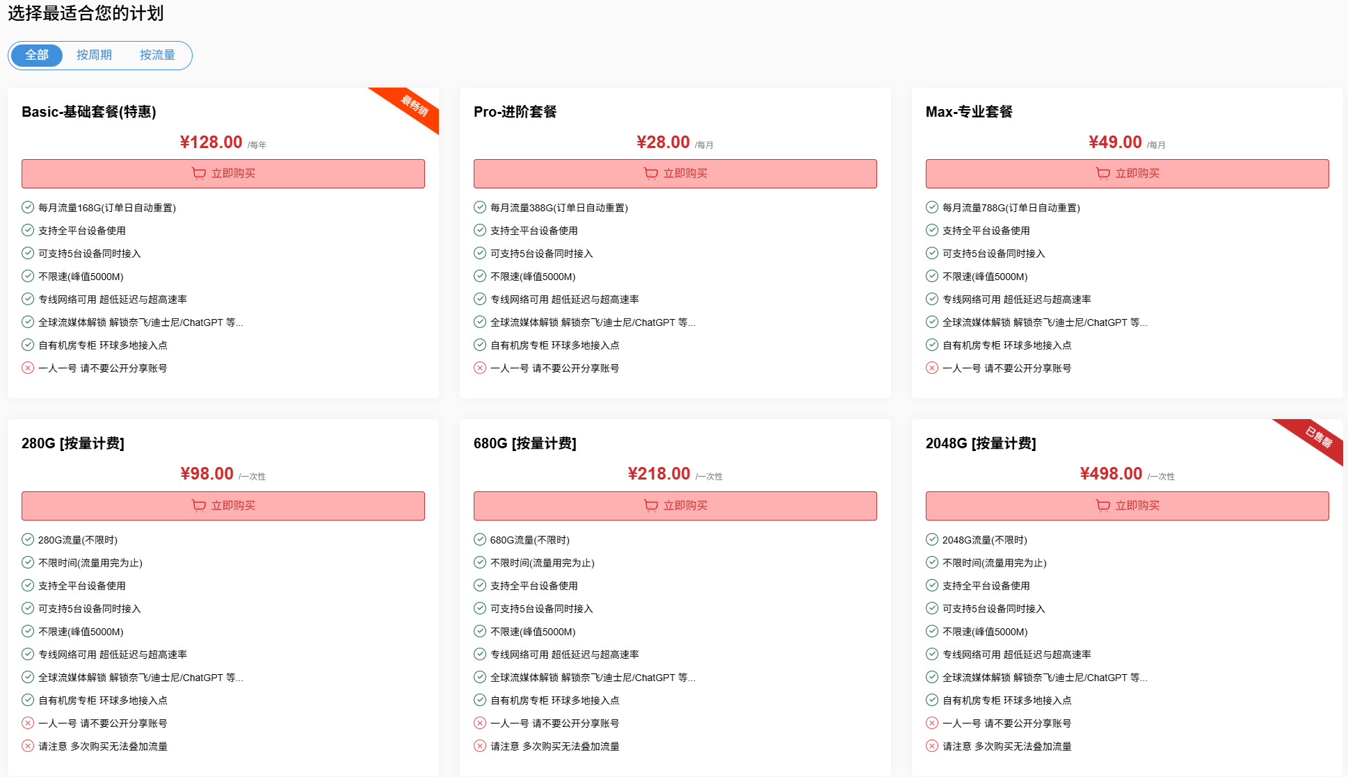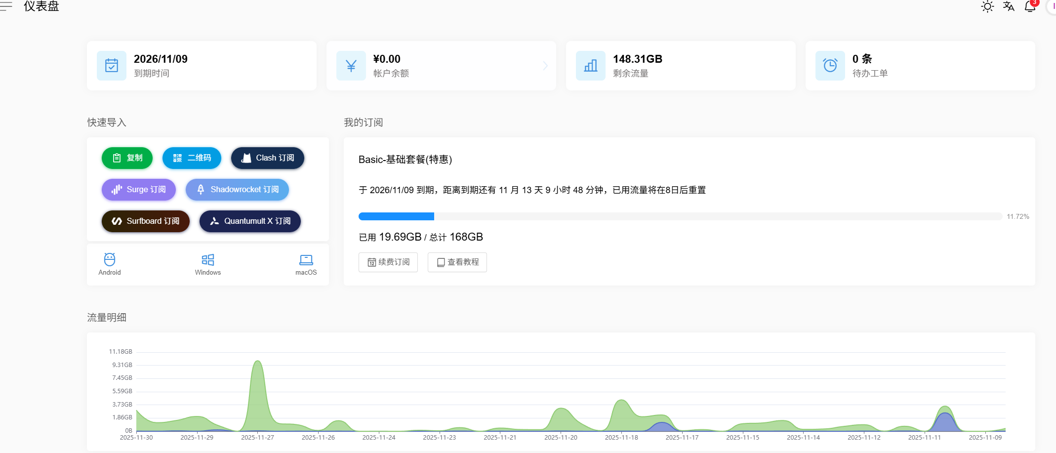 • 一键导入: 购买套餐后,后台提供“一键订阅”功能,直接导入到 Clash 或 Shadowrocket 中,无需手动配置复杂的参数。