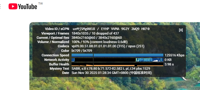 很多服务商白天很快,一到晚上 8 点就“拉胯”。得益于充足的带宽储备,奈云在晚高峰时段的表现依然坚挺。实测 YouTube 4K 秒开,缓冲条跑得飞快,甚至 8K 视频也能流畅拖动。
